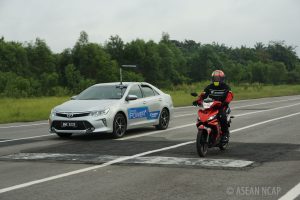 In today’s development test, ASEAN NCAP is testing 10 car models, which are sold in the ASEAN market, fitted with various types of BSTs. Each car will be tested against 10 target motorcycles that are popular in terms of sales in the ASEAN region. Two types of assessment will be performed that are test during daytime and another one at night. During the day, all 10 car models will be run against all 10 target motorcycles, while at night only five car models will be tested against the same 10 motorcycle models.